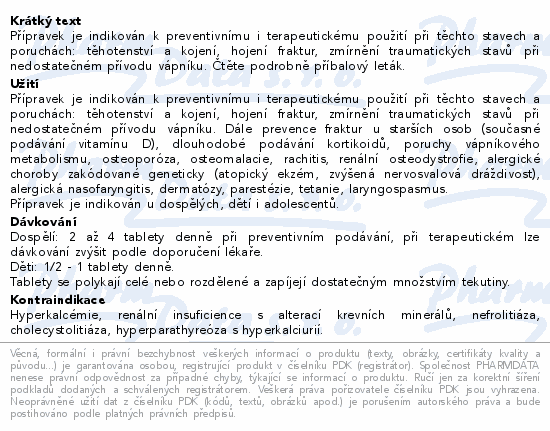 Přípravek je určen k léčbě nebo prevenci nedostatku vápníku, například při osteoporóze, během těhotenství a kojení, v období růstu nebo při nedostatečném příjmu vápníku ze stravy. Vápník se také uplatňuje při podpoře správné srážlivosti krve, v přenosu nervových vzruchů a funkci trávicích enzymů. Dalšími důležitými indikacemi jsou například: hojení zlomenin, dlouhodobá léčba kortikoidy, alergická onemocnění (atopický ekzém, alergický zánět nosohltanu, dermatózy) nebo zvýšená nervosvalová dráždivost (tetanie) a křeče.