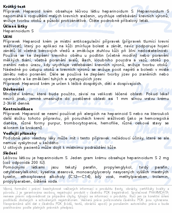Přípravek Heparoid krém obsahuje léčivou látku heparinoidum S. Heparinoidum S napomáhá k rozpuštění malých krevních sraženin, urychluje vstřebávání krevních výronů, snižuje tvorbu otoků a působí protizánětlivě. Čtěte pozorně příbalový leták.
