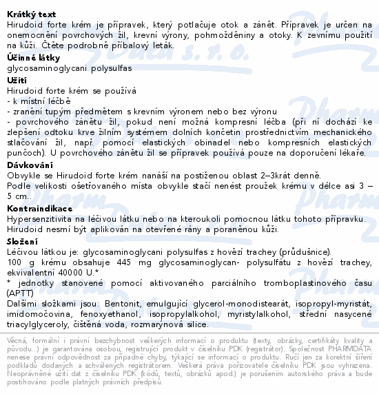 Hirudoid forte krém je přípravek, který potlačuje otok a zánět. Přípravek je určen na onemocnění povrchových žil, krevní výrony, pohmožděniny a otoky. K zevnímu použití na kůži. Čtěte pozorně příbalový leták.