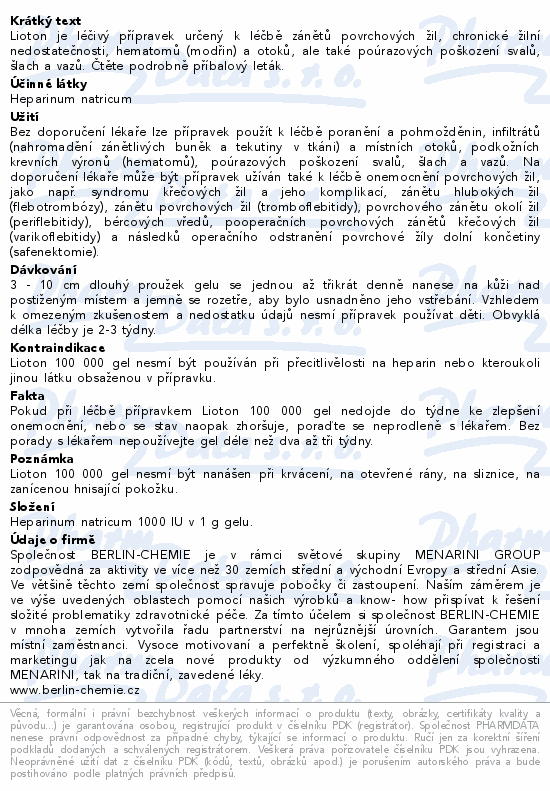 Lioton je léčivý přípravek určený k léčbě zánětů povrchových žil, chronické žilní nedostatečnosti, hematomů (modřin) a otoků, ale také poúrazových poškození svalů, šlach a vazů. Čtěte pozorně příbalový leták.