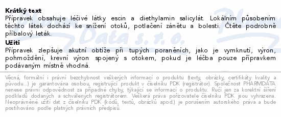 Přípravek obsahuje léčivé látky escin a diethylamin salicylát. Lokálním působením těchto látek dochází ke snížení otoků, potlačení zánětu a bolesti. Čtěte pozorně příbalový leták.