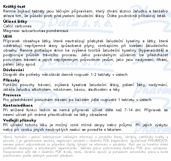 Rennie žvýkací tablety jsou léčivým přípravkem, který chrání sliznici žaludku a tenkého střeva tím, že působí proti překyselení žaludeční šťávy. Čtěte pozorně příbalový leták.