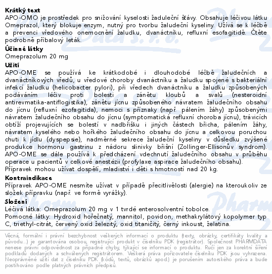 APO-OMO je prostředek pro snižování kyselosti žaduleční šťávy. Obsahuje léčivou látku Omeprazol, který blokuje enzym, nutný pro tvorbu žaludeční kyseliny. Užívá se k léčbě a prevenci vředového onemocnění žaludku, dvanáctníku, refluxní esofagitidě. Čtěte pozorně příbalový leták.