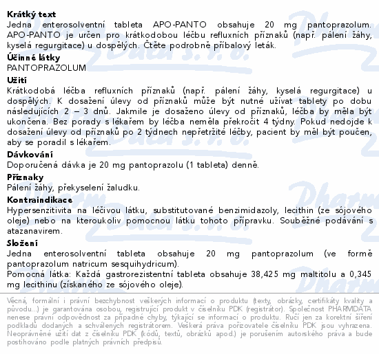 Jedna enterosolventní tableta APO-PANTO obsahuje 20 mg pantoprazolum. APO-PANTO je určen pro krátkodobou léčbu refluxních příznaků (např. pálení žáhy, kyselá regurgitace) u dospělých. Čtěte pozorně příbalový leták.