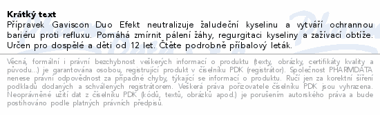 Přípravek Gaviscon Duo Efekt neutralizuje žaludeční kyselinu a vytváří ochrannou bariéru proti refluxu. Pomáhá zmírnit pálení žáhy, regurgitaci kyseliny a zažívací obtíže. Určen pro dospělé a děti od 12 let. Čtěte pozorně příbalový leták.