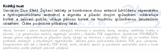 Gaviscon Duo Efekt je volně prodejný léčivý přípravek, který je určen k rychlé a dvojí úlevě od příznaků souvisejících s refluxem žaludeční kyseliny. Primárně se používá na pálení žáhy a zažívací potíže (dyspepsii). Přípravek má unikátní dvojí mechanismus účinku, který zajišťuje rychlou a efektivní úlevu: 1. Vytváří ochrannou bariéru díky alginátu sodnému, který se v žaludku rychle přemění na gelovitou vrstvu, která funguje jako fyzická bariéra a brání zpětnému toku (refluxu) žaludeční kyseliny do jícnu 2. Neutralizuje žaludeční kyselinu - obsahuje také antacida, konkrétně uhličitan vápenatý a hydrogenuhličitan sodný – tyto látky přímo neutralizují nadměrnou žaludeční kyselinu, což vede k okamžitému snížení kyselosti a úlevě od bolesti a nepohodlí Gaviscon Duo Efekt je určen pro dospělé, děti od 12 let a je také považován za bezpečný pro těhotné a kojící ženy, ale vždy je vhodné poradit se s lékařem nebo lékárníkem.