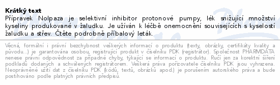 Přípravek Nolpaza je selektivní inhibitor protonové pumpy, lék snižující množství kyseliny produkované v žaludku. Je užíván k léčbě onemocnění souvisejících s kyselostí žaludku a střev. Čtěte pozorně příbalový leták.