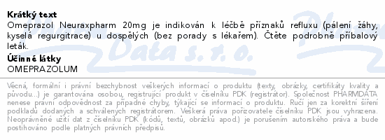 Omeprazol Neuraxpharm 20mg je indikován k léčbě příznaků refluxu (pálení žáhy, kyselá regurgitrace) u dospělých (bez porady s lékařem). Čtěte pozorně příbalový leták.