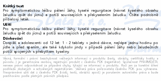 Pro symptomatickou léčbu pálení žáhy, kyselé regurgitace (návrat kyselého obsahu žaludku zpět do jícnu) a potíží souvisejících s překyselením žaludku. Čtěte pozorně příbalový leták.