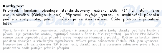 Přípravek Tanakan obsahuje standardizovaný extrakt EGb 761 z listů jinanu dvoulaločného (Ginkgo biloba). Přípravek zvyšuje syntézu a uvolňování působku jménem acetylcholin, jehož množství je ve stáří sníženo. Čtěte pozorně příbalový leták.