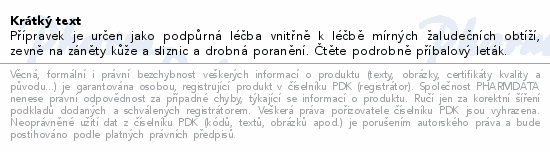 Přípravek je určen jako podpůrná léčba vnitřně k léčbě mírných žaludečních obtíží, zevně na záněty kůže a sliznic a drobná poranění. Čtěte pozorně příbalový leták.