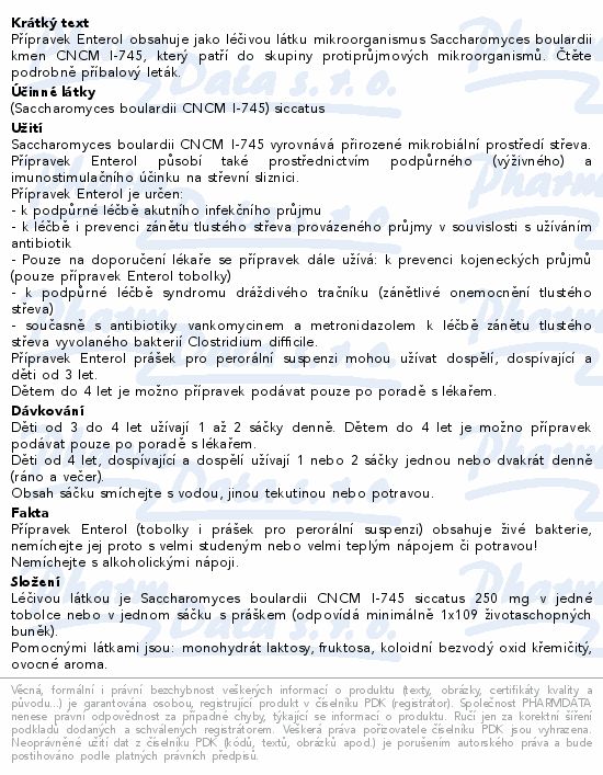Enterol je léčivý přípravek, který mohou užívat dospělí, dospívající i děti. Enterol je určen k podpůrné léčbě akutního infekčního průjmu, k léčbě i prevenci zánětu tlustého střeva provázeného průjmy v souvislosti s užíváním antibiotik a k podpůrné léčbě syndromu dráždivého tračníku.