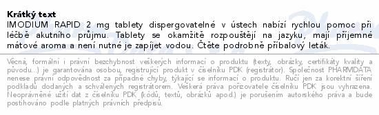 IMODIUM RAPID 2 mg tablety dispergovatelné v ústech nabízí rychlou pomoc při léčbě akutního průjmu. Tablety se okamžitě rozpouštějí na jazyku, mají příjemné mátové aroma a není nutné je zapíjet vodou. Čtěte pozorně příbalový leták.