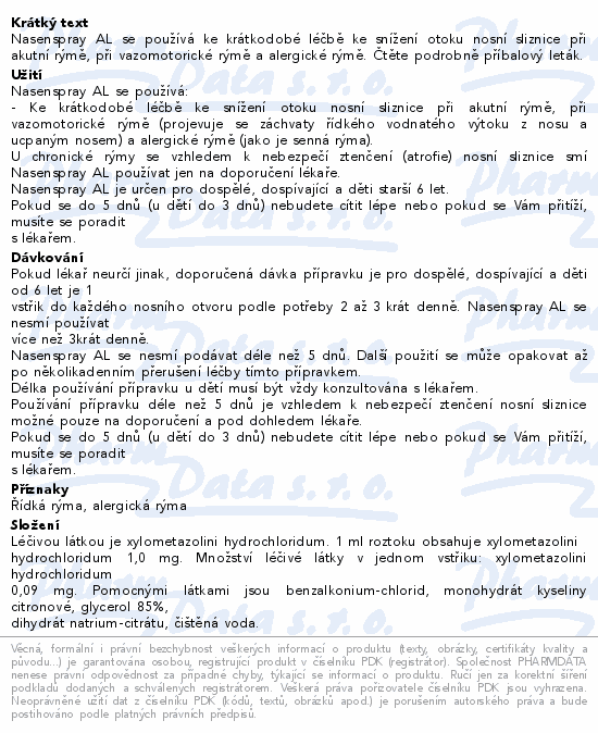 Nasenspray AL se používá ke krátkodobé léčbě ke snížení otoku nosní sliznice při akutní rýmě, při vazomotorické rýmě a alergické rýmě. Čtěte pozorně příbalový leták.