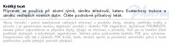Přípravek se používá při akutní rýmě, zánětu středouší, kataru Eustachovy trubice a zánětu vedlejších nosních dutin. Čtěte pozorně příbalový leták.