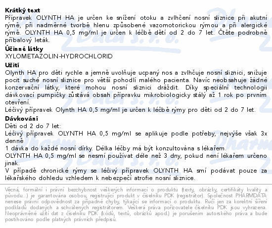 Nosní sprej Olynth HA pro děti od 2 do 7 let rychle a jemně uvolňuje ucpaný nos a zvlhčuje nosní sliznici. Nedráždí nosní sliznici a nevyvolává tak u dětí nepříjemné pocity pálení v nose. Neobsahuje konzervační látky. Čtěte pozorně příbalový leták.