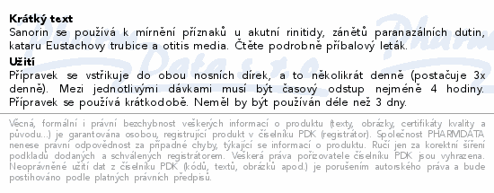 Sanorin se používá k mírnění příznaků u akutní rinitidy, zánětů paranazálních dutin, kataru Eustachovy trubice a otitis media. Čtěte pozorně příbalový leták.