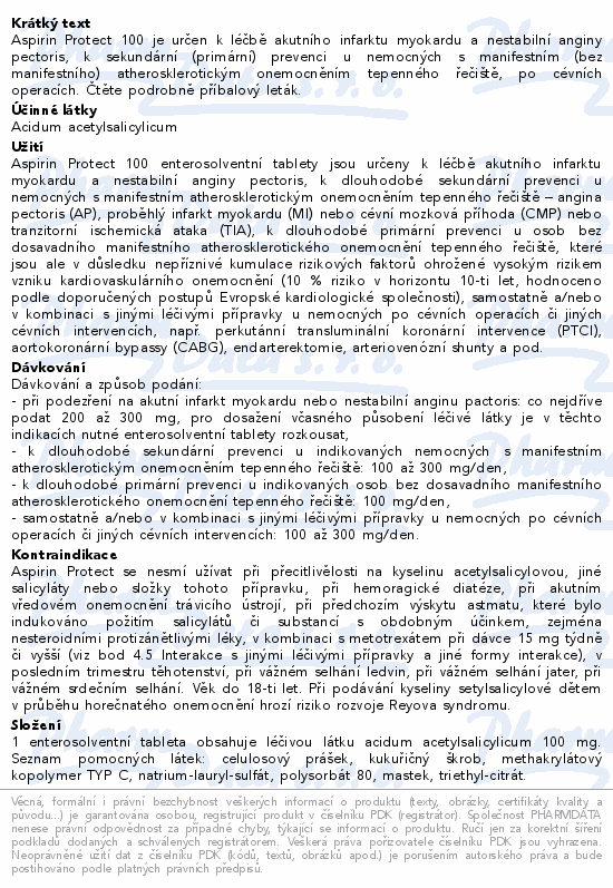 Aspirin Protect 100 je určen k léčbě akutního infarktu myokardu a nestabilní anginy pectoris, k sekundární (primární) prevenci u nemocných s manifestním (bez manifestního) atherosklerotickým onemocněním tepenného řečiště, po cévních operacích. Čtěte pozorně příbalový leták.