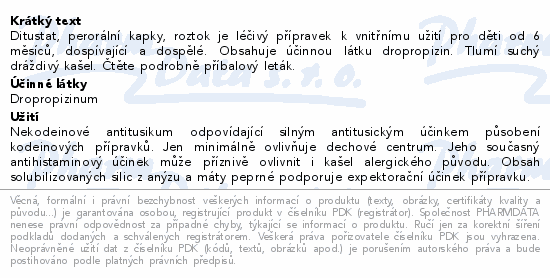 Ditustat tlumí dráždivý kašel při zánětech hrtanu, akutních i chronických zánětech dýchacích cest, pneumotoraxu a krvácení z dýchacích cest. Přípravek je určen pro dospělé i děti od 6 měsíců. Čtěte pozorně příbalový leták.