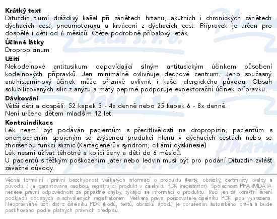 Dituzdin tlumí dráždivý kašel při zánětech hrtanu, akutních i chronických zánětech dýchacích cest, pneumotoraxu a krvácení z dýchacích cest. Přípravek je určen pro dospělé i děti od 6 měsíců. Čtěte pozorně příbalový leták.