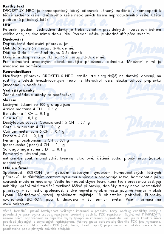 DROSETUX NEO je homeopatický léčivý přípravek užívaný tradičně v homeopatii k léčbě suchého kašle, dráždivého kašle nebo jiných forem neproduktivního kašle. Čtěte pozorně příbalový leták.