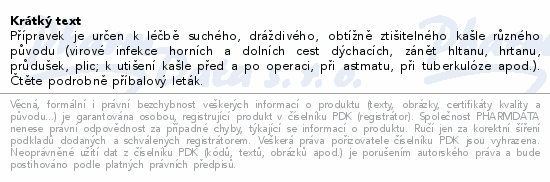 Přípravek je určen k léčbě suchého, dráždivého, obtížně ztišitelného kašle různého původu (virové infekce horních a dolních cest dýchacích, zánět hltanu, hrtanu, průdušek, plic; k utišení kašle před a po operaci, při astmatu, při tuberkulóze apod.). Čtěte pozorně příbalový leták.