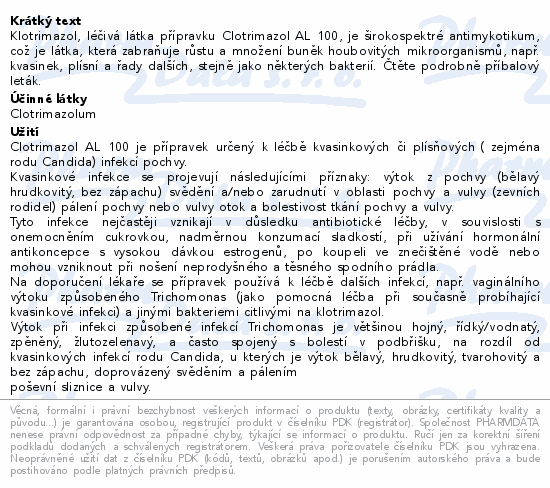 Klotrimazol, léčivá látka přípravku Clotrimazol AL 100, je širokospektré antimykotikum, což je látka, která zabraňuje růstu a množení buněk houbovitých mikroorganismů, např. kvasinek, plísní a řady dalších, stejně jako některých bakterií. Čtěte pozorně příbalový leták.