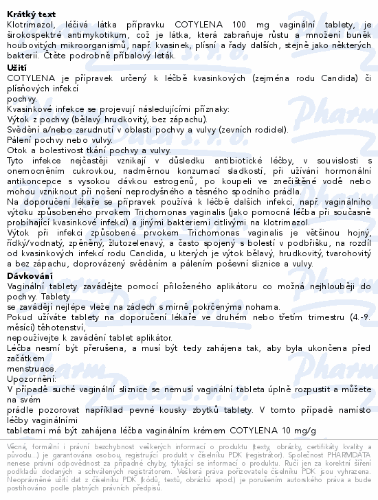 Klotrimazol, léčivá látka přípravku COTYLENA 100 mg vaginální tablety, je širokospektré antimykotikum, což je látka, která zabraňuje růstu a množení buněk houbovitých mikroorganismů, např. kvasinek, plísní a řady dalších, stejně jako některých bakterií. Čtěte pozorně příbalový leták.