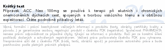 Přípravek ACC 100 NEO se používáí k terapii při akutních i chronických onemocněních dýchacích cest, spojených s tvorbou viskózního hlenu a s obtížnou expektorací. Čtěte pozorně příbalový leták.