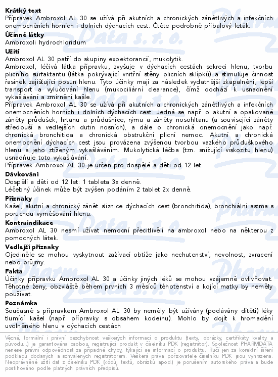 Přípravek Ambroxol AL 30 se užívá při akutních a chronických zánětlivých a infekčních onemocněních horních i dolních dýchacích cest. Čtěte pozorně příbalový leták.
