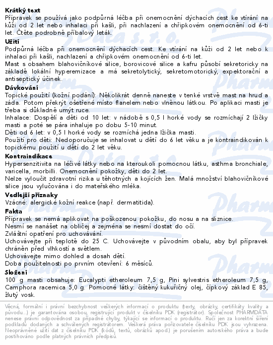 Přípravek se používá jako podpůrná léčba při onemocnění dýchacích cest ke vtírání na kůži od 2 let nebo inhalaci při kašli, při nachlazení a chřipkovém onemocnění od 6-ti let. Čtěte pozorně příbalový leták.