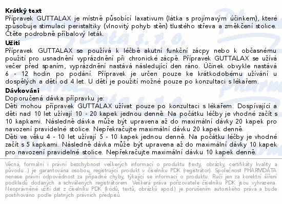 Přípravek GUTTALAX je místně působící laxativum (látka s projímavým účinkem), které způsobuje stimulaci peristaltiky (vlnovitý pohyb stěn) tlustého střeva a změkčení stolice. Čtěte pozorně příbalový leták.