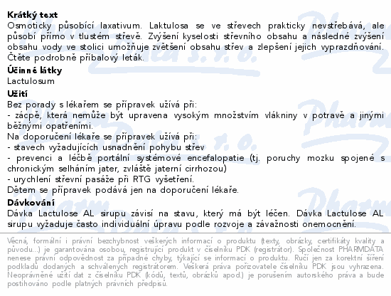 Osmoticky působící laxativum. Laktulosa se ve střevech prakticky nevstřebává, ale působí přímo v tlustém střevě. Zvýšení kyselosti střevního obsahu a následné zvýšení obsahu vody ve stolici umožňuje zvětšení obsahu střev a zlepšení jejich vyprazdňování. Čtěte pozorně příbalový leták.