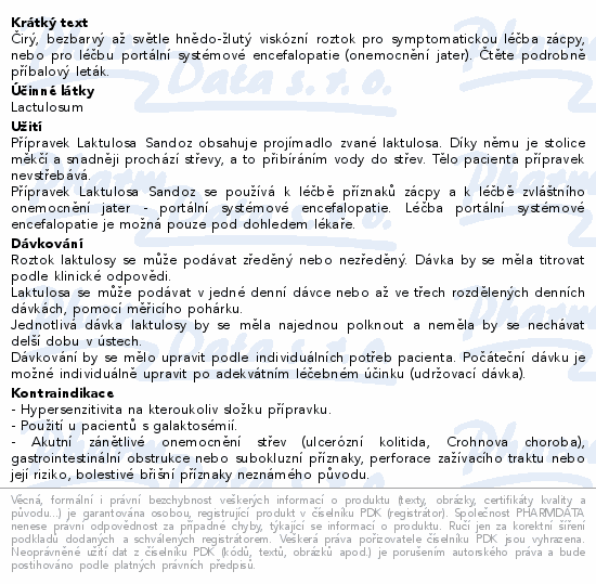 Čirý, bezbarvý až světle hnědo-žlutý viskózní roztok pro symptomatickou léčba zácpy, nebo pro léčbu portální systémové encefalopatie (onemocnění jater). Čtěte pozorně příbalový leták.