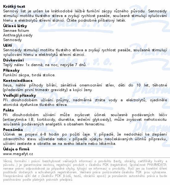 Sennový list je určen ke krátkodobé léčbě funkční zácpy různého původu. Sennosidy stimulují motilitu tlustého střeva a zvyšují rychlost pasáže, současně stimulují vylučování hlenu a elektrolytů střevní sliznicí. Čtěte pozorně příbalový leták.