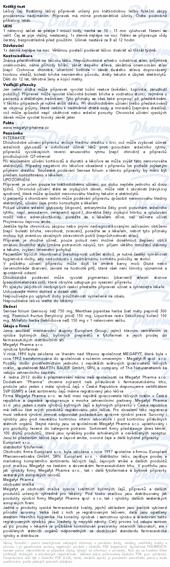 Léčivý čaj. Rostlinný léčivý přípravek určený pro krátkodobou léčbu funkční zácpy provázenou nadýmáním. Přípravek má mírné protizánětlivé účinky. Čtěte pozorně příbalový leták.