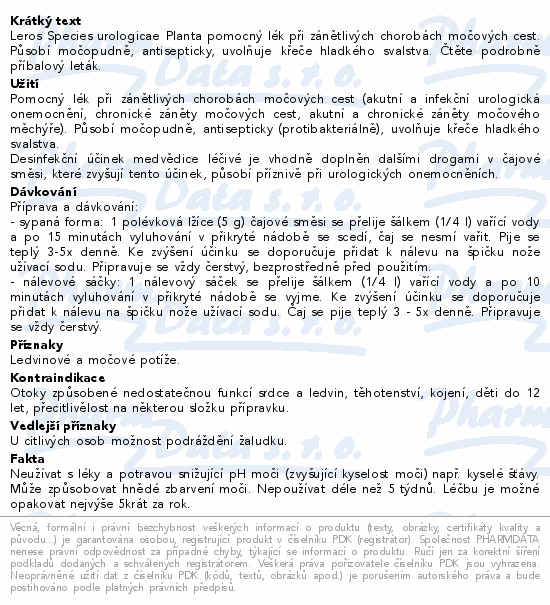 Bylinný čaj LEROS Species urologicae Planta je určený jako doplňková léčba při akutních infekčních chorobách močových cest (které se projevují pálením při močení a častým močením). Působí diureticky, antisepticky (antibakteriálně), spasmolyticky.