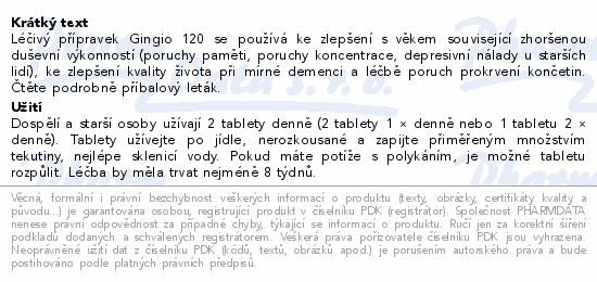 Léčivý přípravek Gingio 120 se používá ke zlepšení s věkem související zhoršenou duševní výkonností (poruchy paměti, poruchy koncentrace, depresivní nálady u starších lidí), ke zlepšení kvality života při mírné demenci a léčbě poruch prokrvení končetin. Čtěte pozorně příbalový leták.