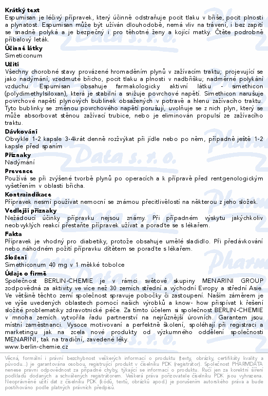 Espumisan je léčivý přípravek, který účinně odstraňuje pocit tlaku v břiše, pocit plnosti a plynatost. Espumisan může být užíván dlouhodobě, nemá vliv na trávení, i bez zapití se snadně polyká a je bezpečný i pro těhotné ženy a kojící matky. Čtěte pozorně příbalový leták.