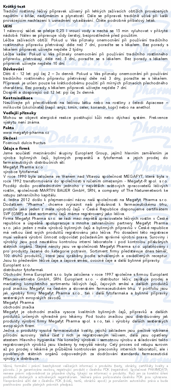 Tradiční rostlinný léčivý přípravek užívaný při lehkých zažívacích obtížích provázených napětím v břiše, nadýmáním a plynatostí. Dále se přípravek tradičně užívá při kašli provázejícím nachlazení k usnadnění vykašlávání. Čtěte pozorně příbalový leták.