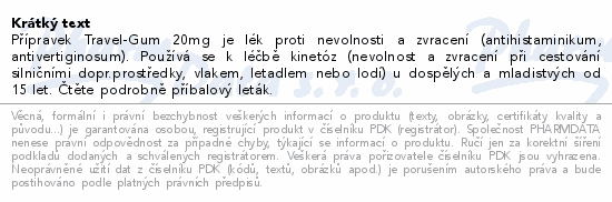 Přípravek Travel-Gum 20mg je lék proti nevolnosti a zvracení (antihistaminikum, antivertiginosum). Používá se k léčbě kinetóz (nevolnost a zvracení při cestování silničními dopr.prostředky, vlakem, letadlem nebo lodí) u dospělých a mladistvých od 15 let. Čtěte pozorně příbalový leták.