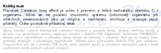 Vitamin C je důležitý antioxidant, který pomáhá chránit buňky před oxidativním stresem. Přispívá k normální funkci imunitního systému, ke snížení únavy a vyčerpání, podílí se na tvorbě kolagenu a podporuje normální funkci cév, kostí, chrupavek, dásní, kůže a zubů. Rovněž zvyšuje vstřebávání železa z potravy. Celaskon Long Effect je vhodný při zvýšené potřebě vitaminu C, například během chřipkových období, při zvýšené fyzické nebo psychické zátěži, u kuřáků, seniorů nebo při rekonvalescenci. Díky postupnému uvolňování je také šetrnější k žaludku než klasické formy vitaminu C. Přípravek mohou užívat těhotné a kojící ženy.