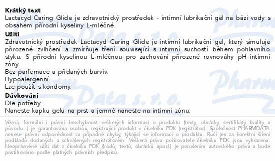 Lactacyd Caring Glide je zdravotnický prostředek - intimní lubrikační gel na bázi vody s obsahem přírodní kyseliny L-mléčné.