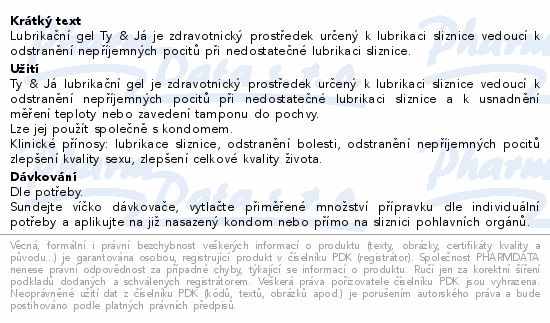 Lubrikační gel Ty & Já je zdravotnický prostředek určený k lubrikaci sliznice vedoucí k odstranění nepříjemných pocitů při nedostatečné lubrikaci sliznice.