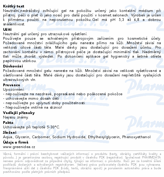 Neutrální gel určený pro utrazvukové a sonografické vyšetření. Pro použití při kavitačních, radiofrekvenčních, ultrazvukových a jiných dermatologických zákroků. V kosmetice lze použít jako vhodný nosič aktivních látek.