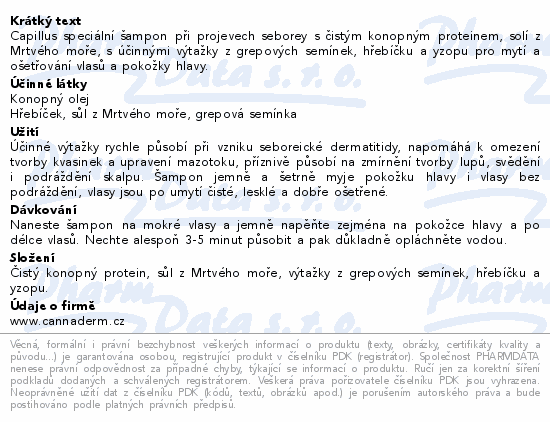 Capillus speciální šampon při projevech seborey s čistým konopným proteinem, solí z Mrtvého moře, s účinnými výtažky z grepových semínek, hřebíčku a yzopu pro mytí a ošetřování vlasů a pokožky hlavy.