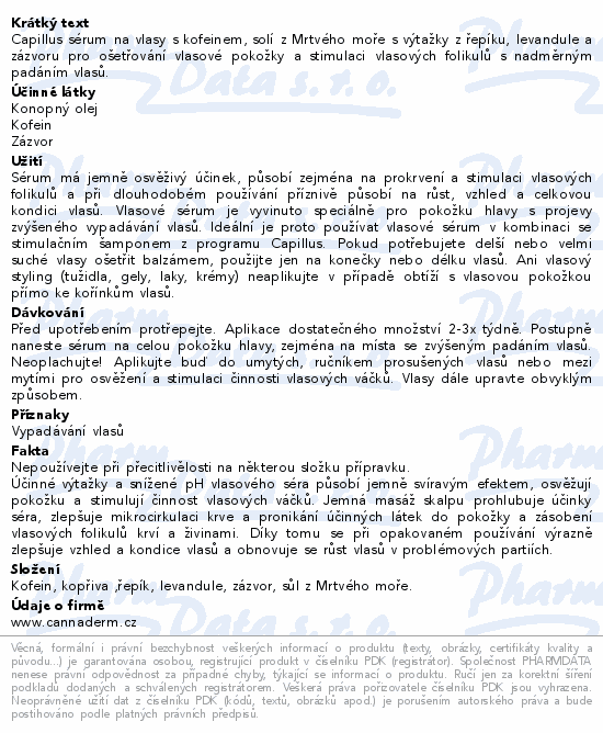 Capillus sérum na vlasy s kofeinem, solí z Mrtvého moře s výtažky z řepíku, levandule a zázvoru pro ošetřování vlasové pokožky a stimulaci vlasových folikulů s nadměrným padáním vlasů.