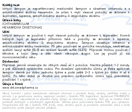 Ichtyol šampon je neparfémovaný medicinální šampon s obsahem ichtamolu a s antimikrobiální složkou hexamidin. Je určen k mytí vlasové pokožky se sklonem k šupinatění, lupence, seborhoickému ekzému či atopickému ekzému.