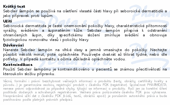 Sebclair šampón se používá na ošetření vlasaté části hlavy při seboroické dermatitidě a jako přípravek proti lupům.