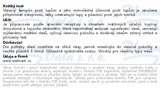 Vlasový šampón proti lupům a jeho mimořádná účinnost proti lupům je zaručena přítomností octopiroxu, látky odstraňující lupy a působící proti jejich tvorbě.